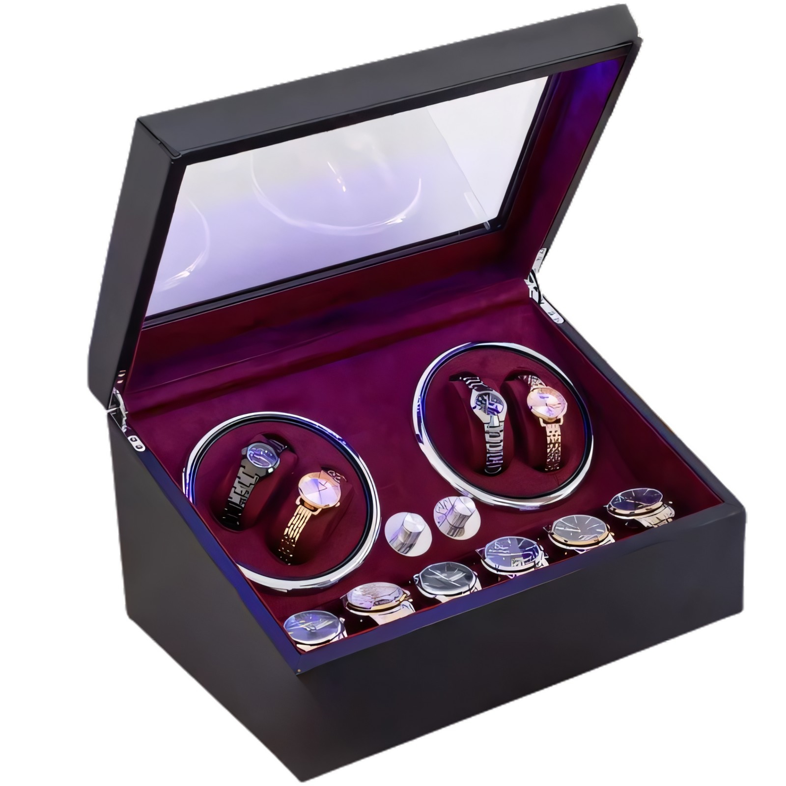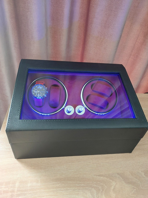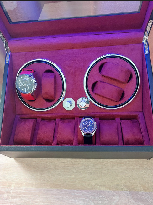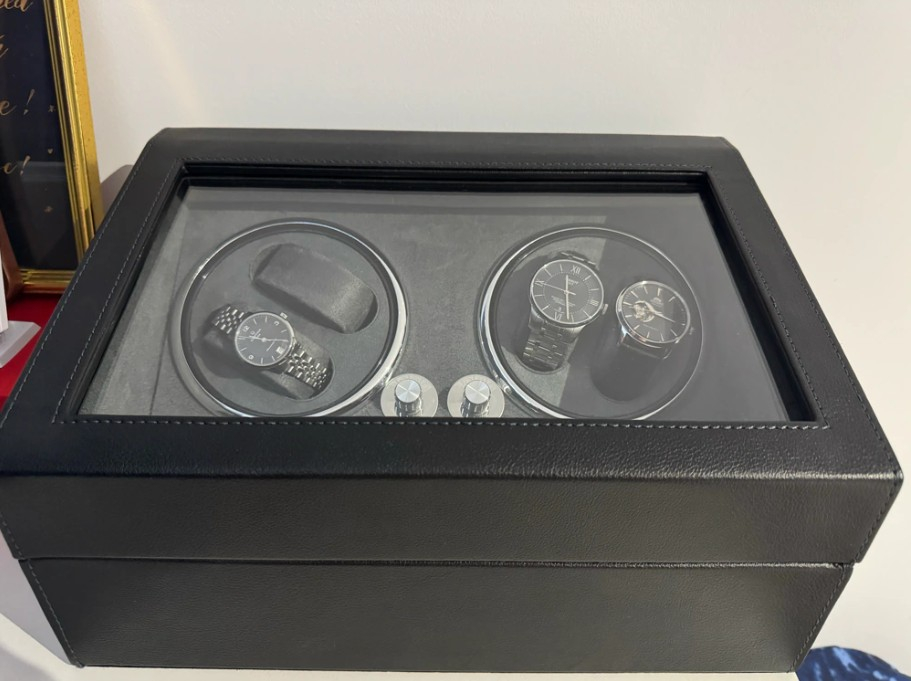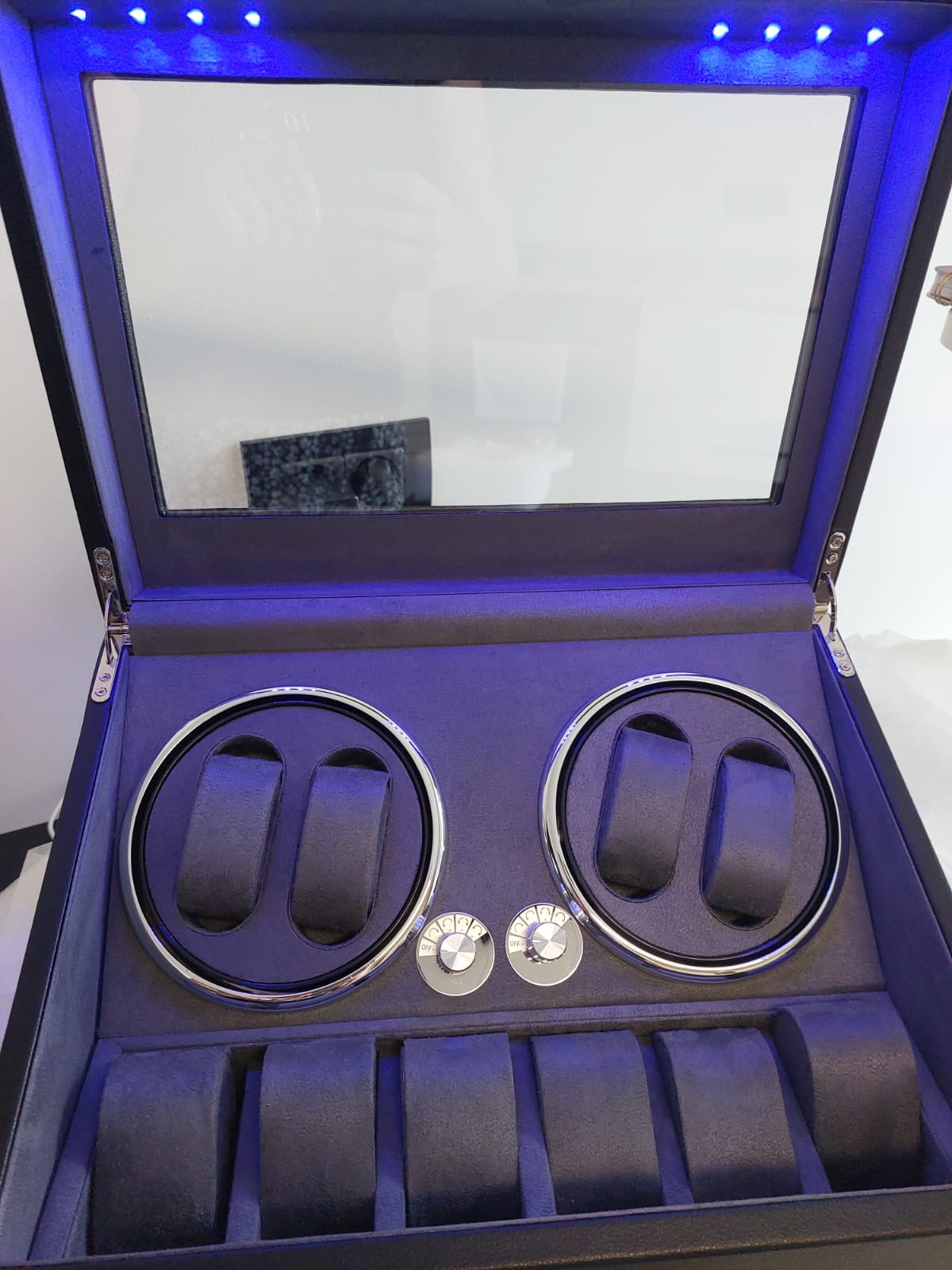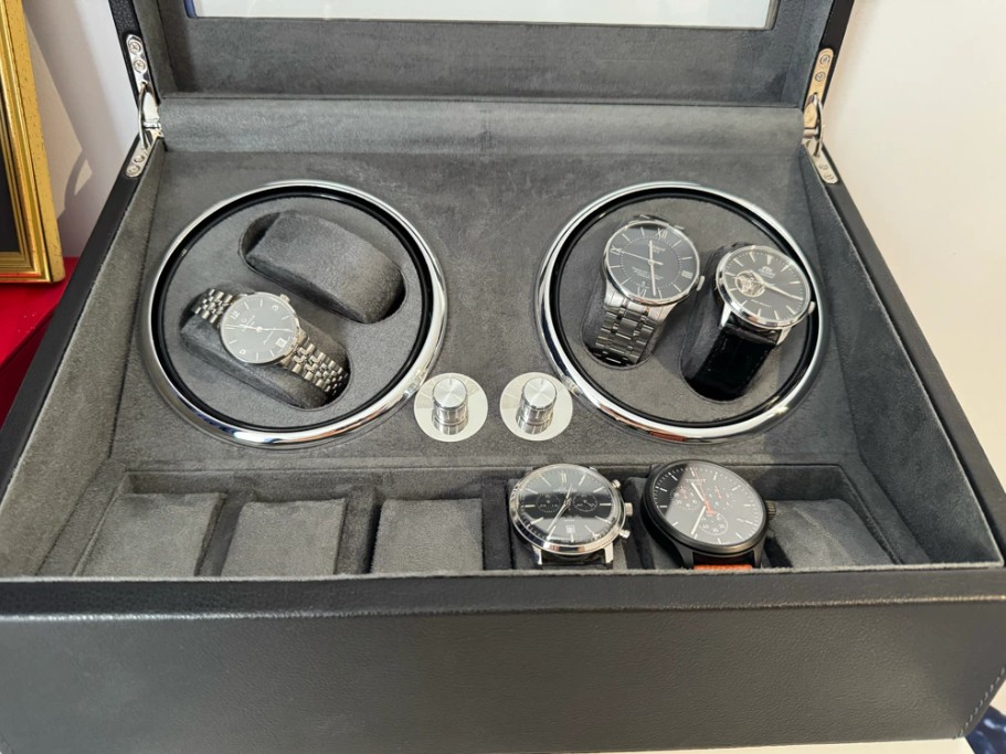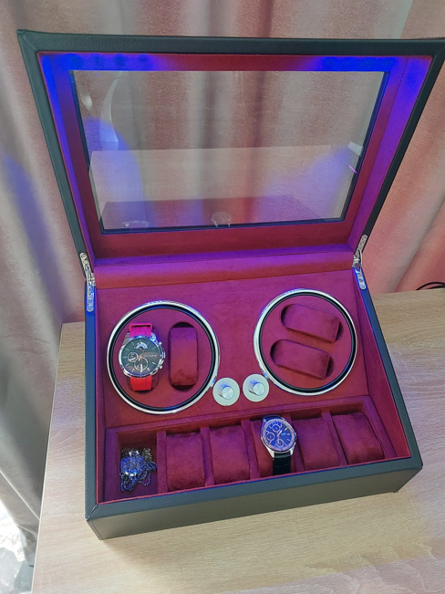 Cutia arată foarte bine, lumina evidențiază ceasurile, iar mecanismul este silențios. Pachetul a sosit rapid și protejat foarte bine in interior, gata de oferit cadou.