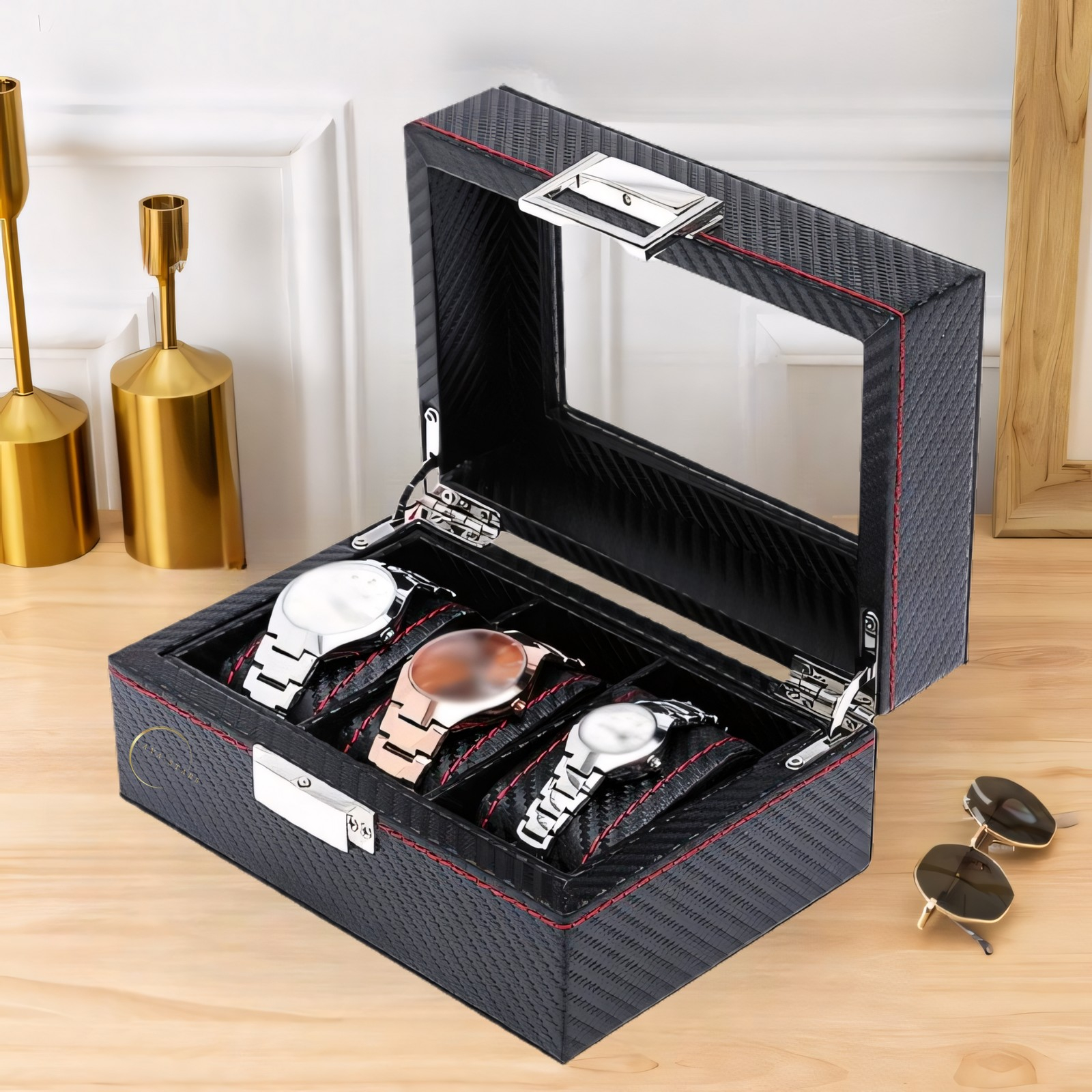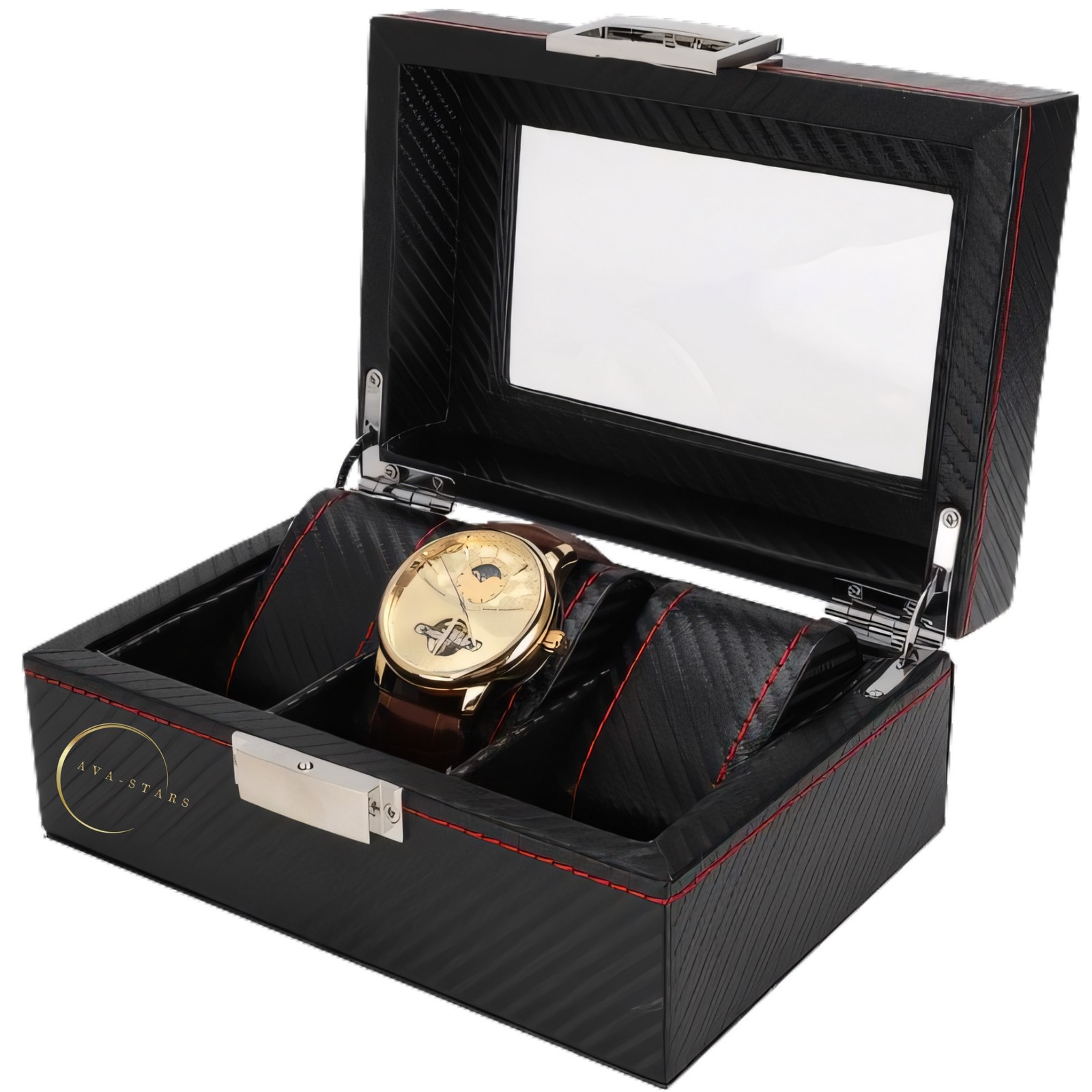 - Design superior: Cu un exterior din fibra de carbon de cea mai buna calitate și un interior luxos din piele, aceasta cutie nu doar protejează, ci și subliniază valoarea ceasurilor si obiectelor tale personale. Fiecare detaliu este conceput pentru a impresiona, oferindu-ti un produs care emana eleganta si rezistenta.