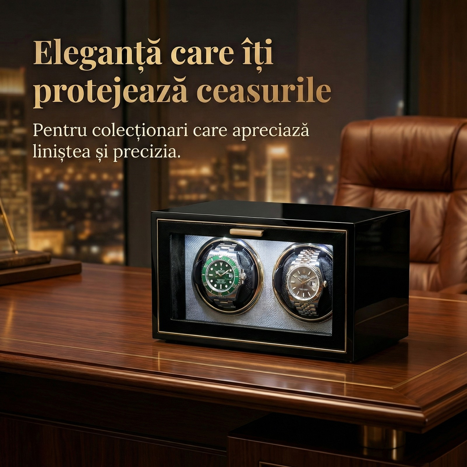Aceasta cutie pentru intors ceasuri automate (watch winder premium) este solutia ideala pentru colectionari si pasionati de ceasuri mecanice. Dispozitivul mentine mecanismul activ, astfel incat ceasurile sa fie mereu pregatite de purtare, fara resetarea orei sau a datei.