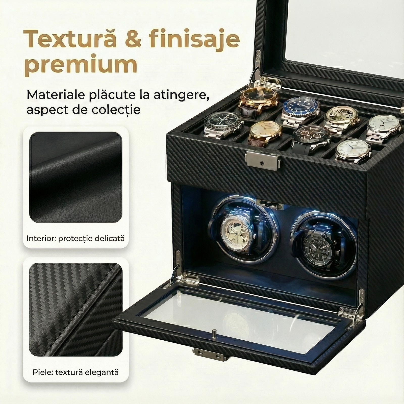 Nu mai aștepta! Adaugă cutia pentru ceasuri automatice în coșul tău astăzi și oferă bijuteriilor tale prețioase un loc elegant și sigur.