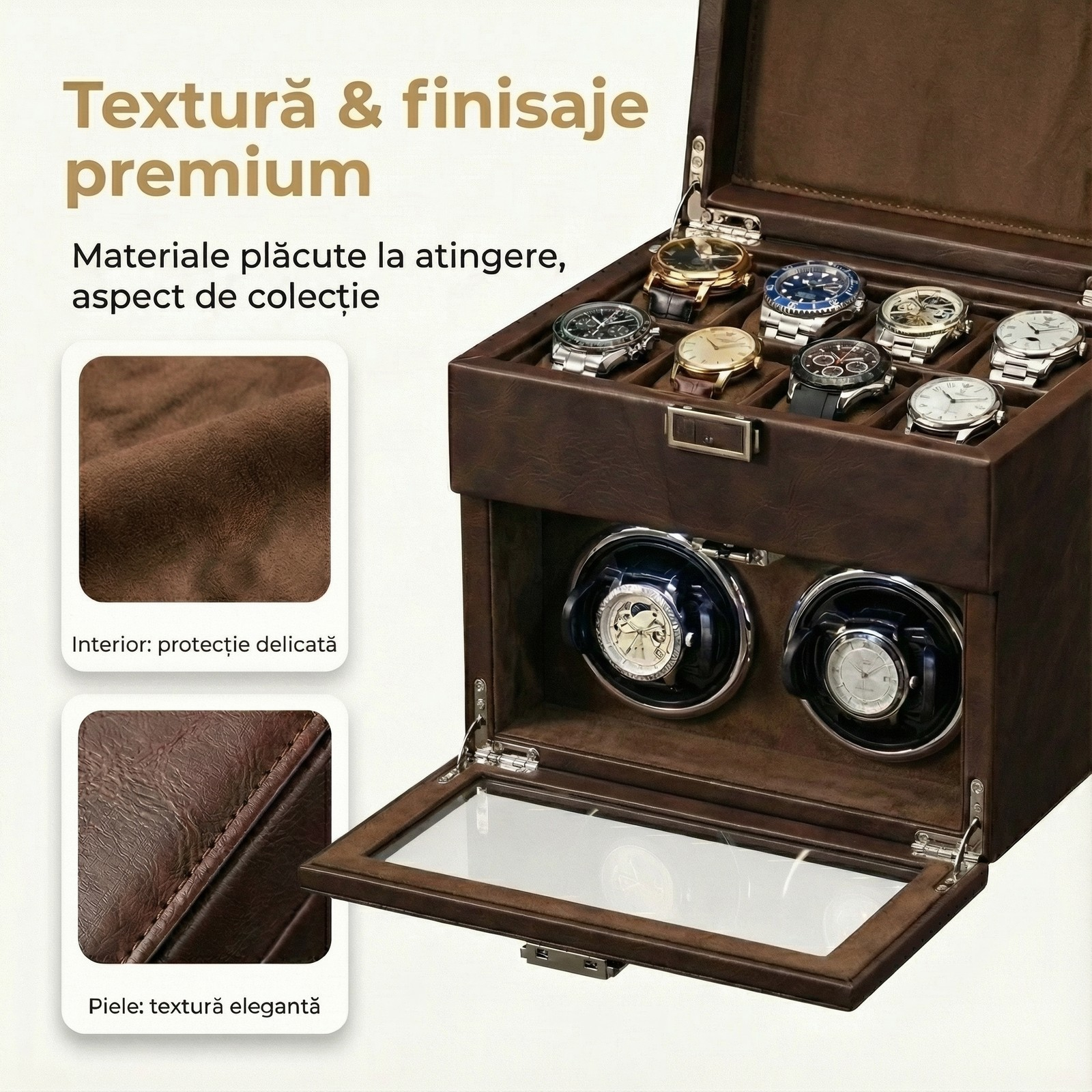 • PROTEJEAZĂ-ȚI CEASURILE: O CUTIE DE CALITATE ESTE O INVESTIȚIE ESENȚIALĂ PENTRU A-ȚI MENȚINE CEASURILE AUTOMATICE ÎN STARE IMPECABILĂ PENTRU ANII URMĂTORI.