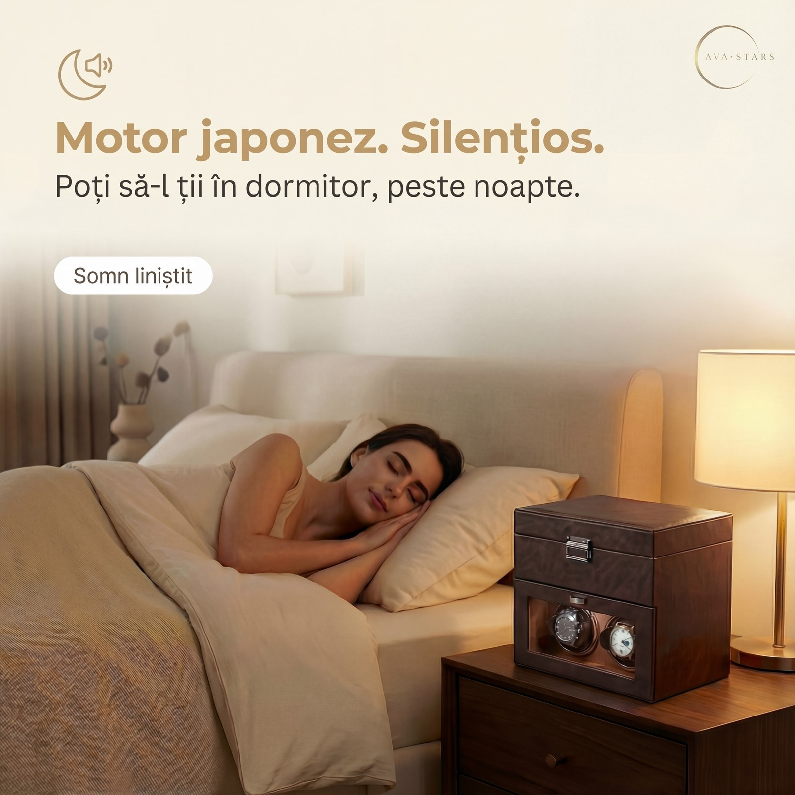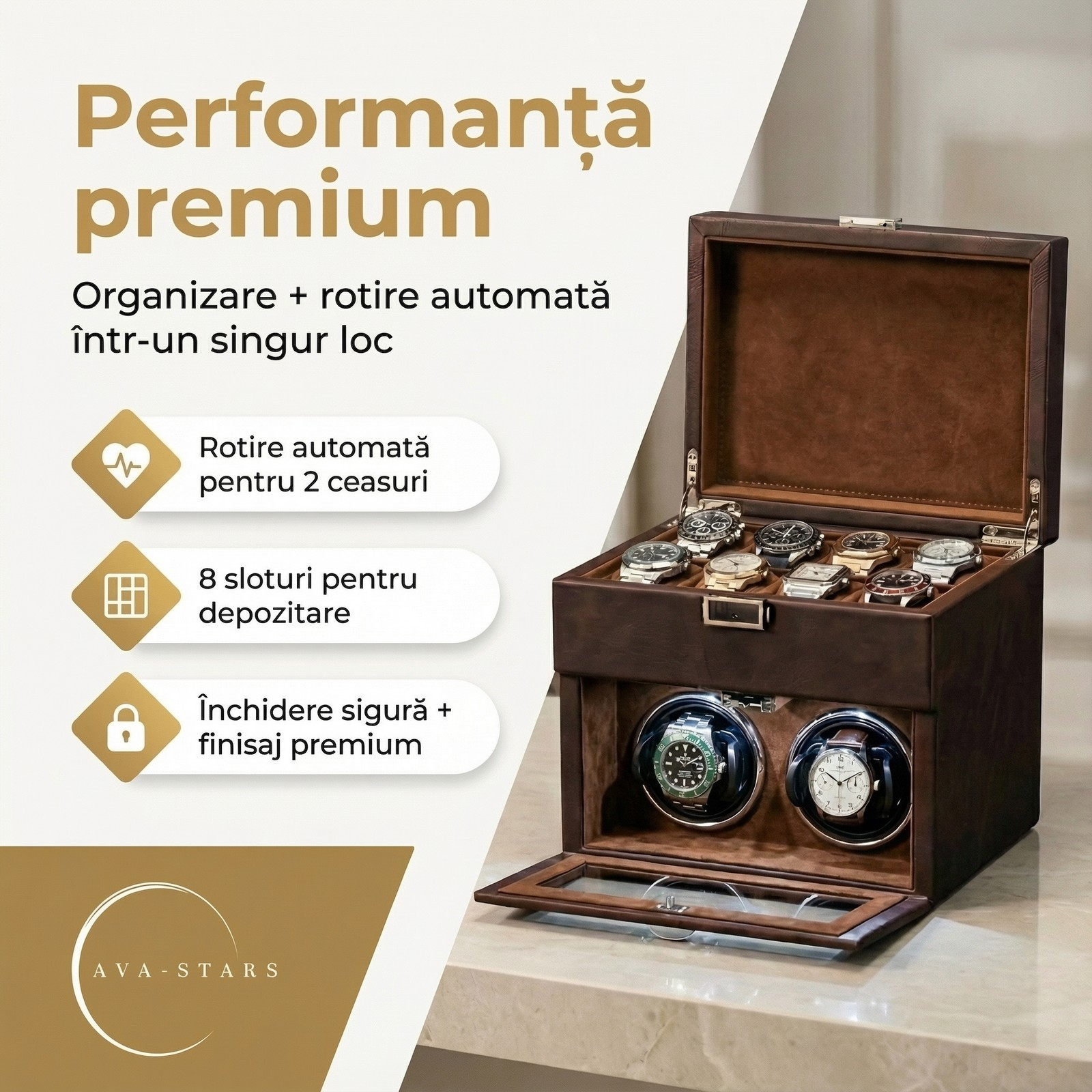 Cutie automata pentru ceasuri Ava Stars Mereu gata de purtat Watch Winder Silentios si Eficient Rotator ceasuri automatice Features Dispozitiv intors ceasuri automatice Cutie întors ceasuri - Ava Stars Cutie de lux pentru ceasuri automatice - Testimoniale Cutie ceasuri automatice Ava Stars CTA