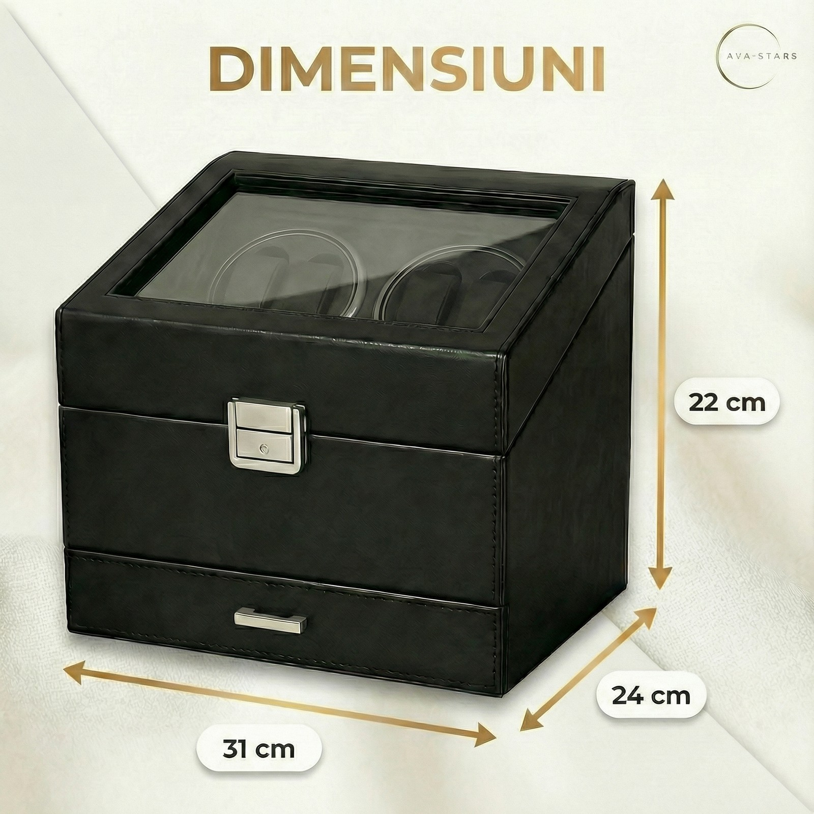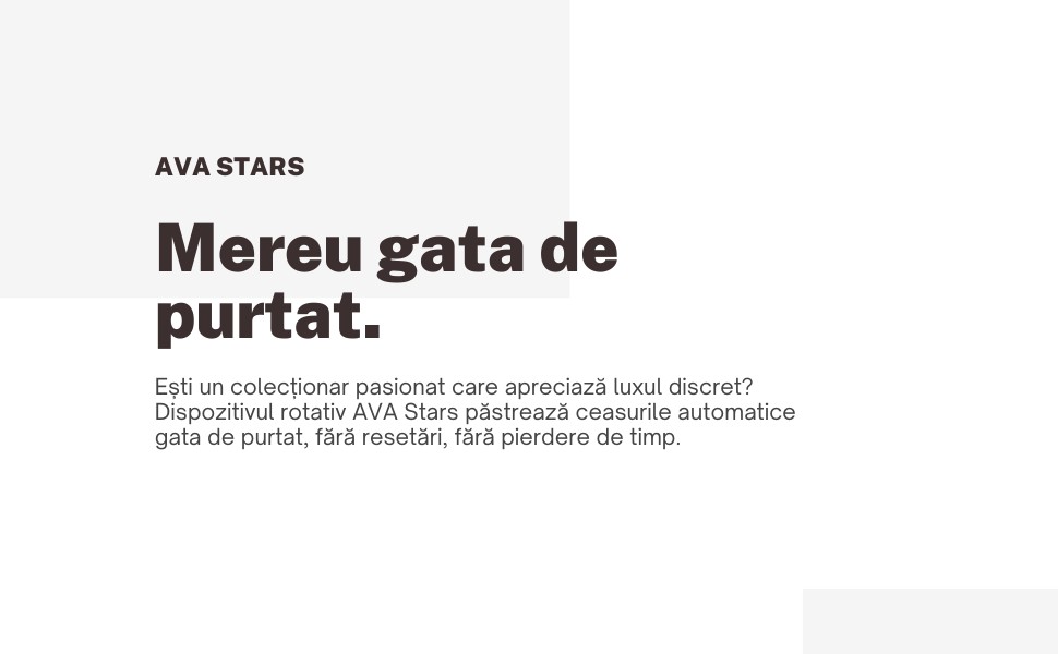 Ești un colecționar care apreciază luxul discret? Dispozitivul rotativ Ava Stars menține ceasurile automate active, astfel încât acestea să fie pregătite oricând, fără resetarea orei sau a datei.