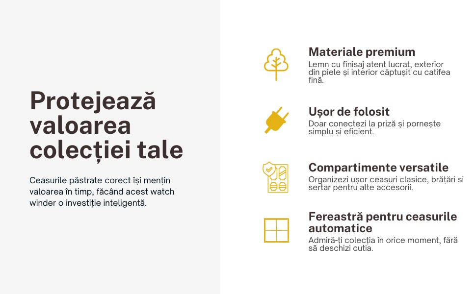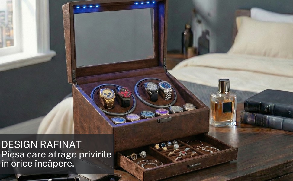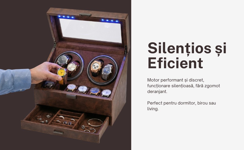 Ceasurile păstrate corect își mențin valoarea în timp, iar acest watch winder devine o investiție inteligentă pentru orice pasionat.